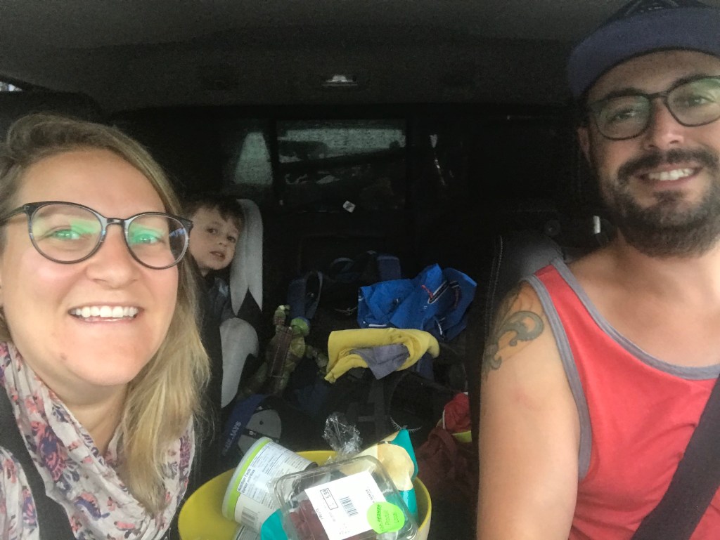 Alors nous sommes partie avec la voiture et une petite roulotte en forme de bulle (gracieuseté mes beaux-parents). Alexis trouve ça bien drôle de partir en direction de Rivière-du-Loup pour le premier arrêt. Il cesse de nous dire pendant les premières heures de route que nous allons à La Tuque au loup. Pourquoi ? Aucune idée, mais nous trouvons le tout très drôle. Il mouille à boire de bout, ou à « sceau » comme on dit au Saguenay. Quelques tunes de country plus tard, on fait un petit arrêt afin de faire le plein de conversation avec nos amis les frenchies (alias Guillaume, Vanessa Oona et Mia). Un petit Facetime longtemps attendu. On s’est promis qu’après presque 3 ans sans se parler, on allait remédier à la situation. Et ils nous ont suppliés de venir faire un tour à St-Malo en terre française… Well well… On n’a pas dit oui, mais on n’a pas Non, non plus. « Plans without plans » notre nouvelle devise, ne l’oubliez pas. Quelques kilomètres plus tard, on arrive enfin à « La Tuque au loup ». Petit camping trouvé et très sympa, on recommande. Il s’agit du camping municipal de la pointe (https://campingmunicipaldelapointe.ca/). Une belle vue (sûrement, car il pleuvait.) sur le fleuve et une belle odeur de mer saline et de varech. Malgré la pluie ou Jean-Michel a eu le bonheur d’installer la roulotte (et de se rappeler pourquoi il n’aimait pas tant le camping), nous avons quand même pu apprécier la tranquillité et le repos dans la bulle. Il faut savoir qu’au départ nous devions partir en tente. Jean-Mich nous a dits : « Moi le Motel de l’Amour, je l’aurais réservé sans aucun doute si nous avions eu qu’une tente ».