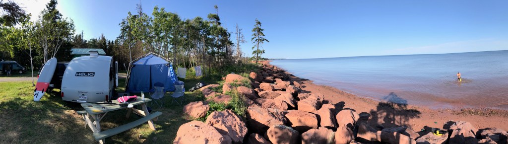 Drôle de fait, il y avait tellement de la mouche là. Genre pire qu’au Saguenay, je vous jure. En sortant du véhicule pour installer la roulotte, c’est presque comme si on était l’équivalent de steak sur deux pattes. Deux trois couches de crème à mouches plus tard nous étions finalement installé un gin à la main avec Alexis qui joue dans l’eau de la mer.