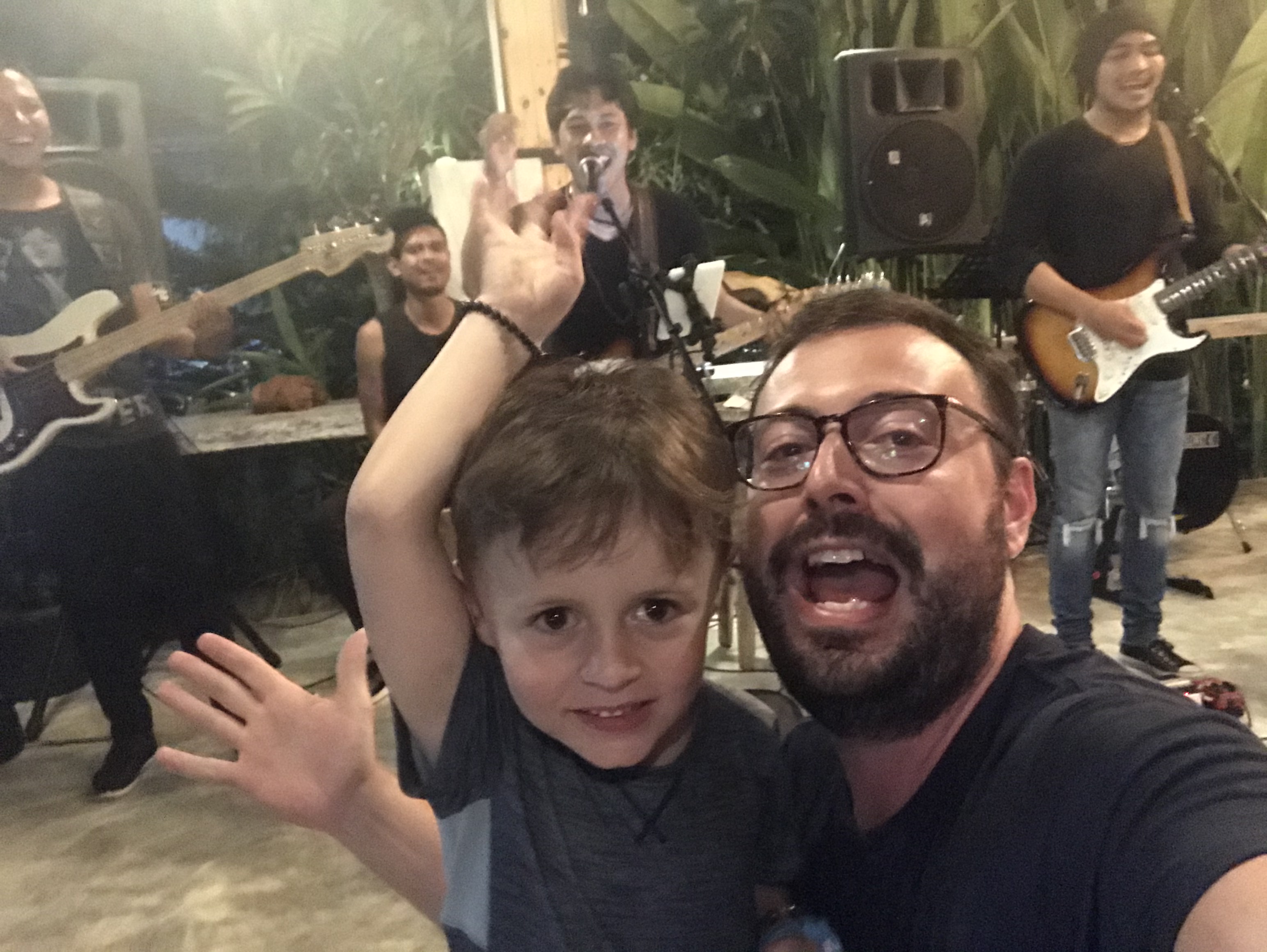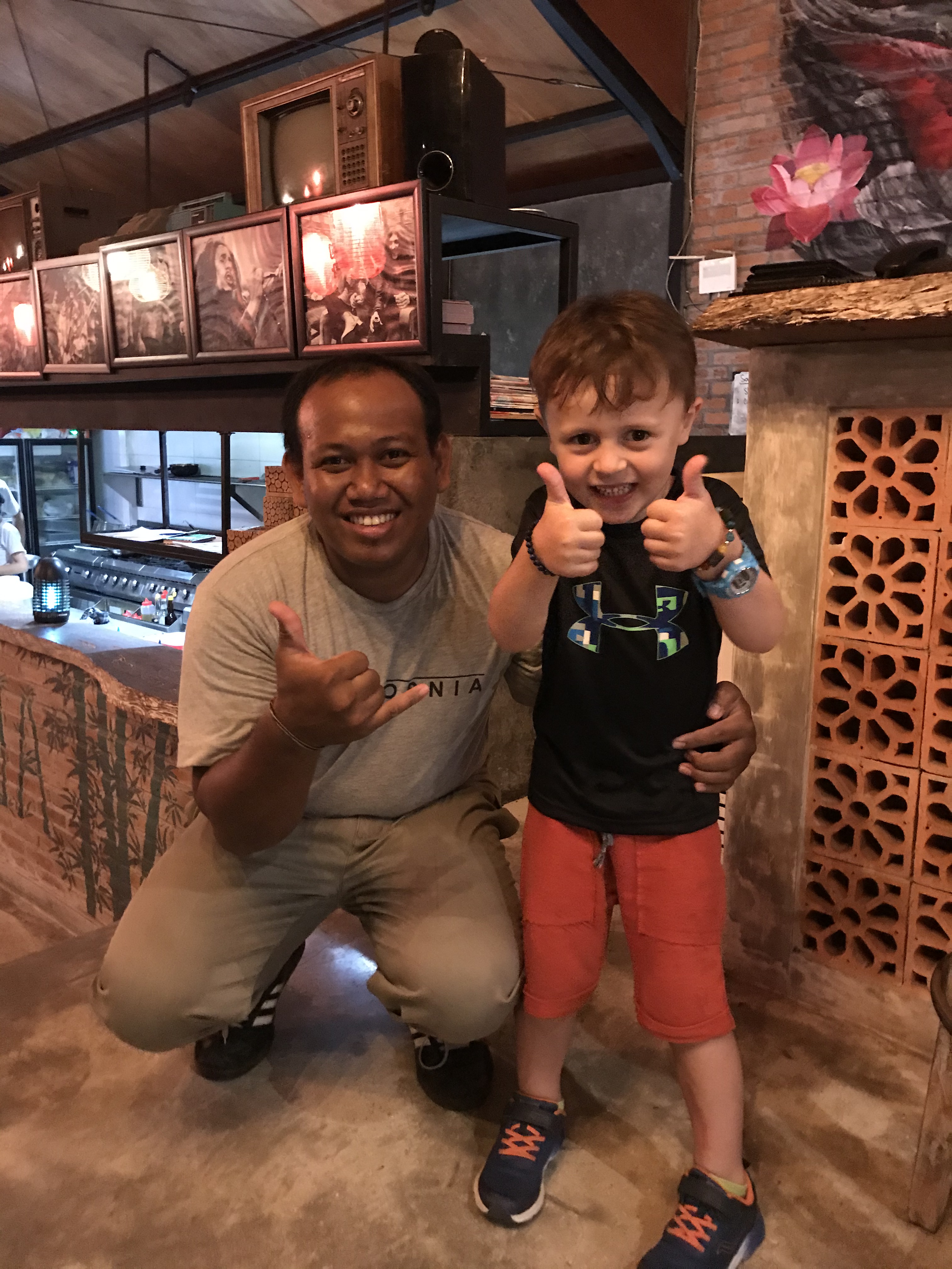 Balifornia : sur le coin de notre hôtel, musique Live à tous les soirs et prix très raisonnable pour les cocktails. Je crois que nous sommes arrêtés chaque soir. Les musiciens étaient tous super et très gentil avec Alexis… En fait, la séparation a même été difficile à la fin, car ils étaient tous pot avec lui ! https://balifornia-kitchen-bar.business.site