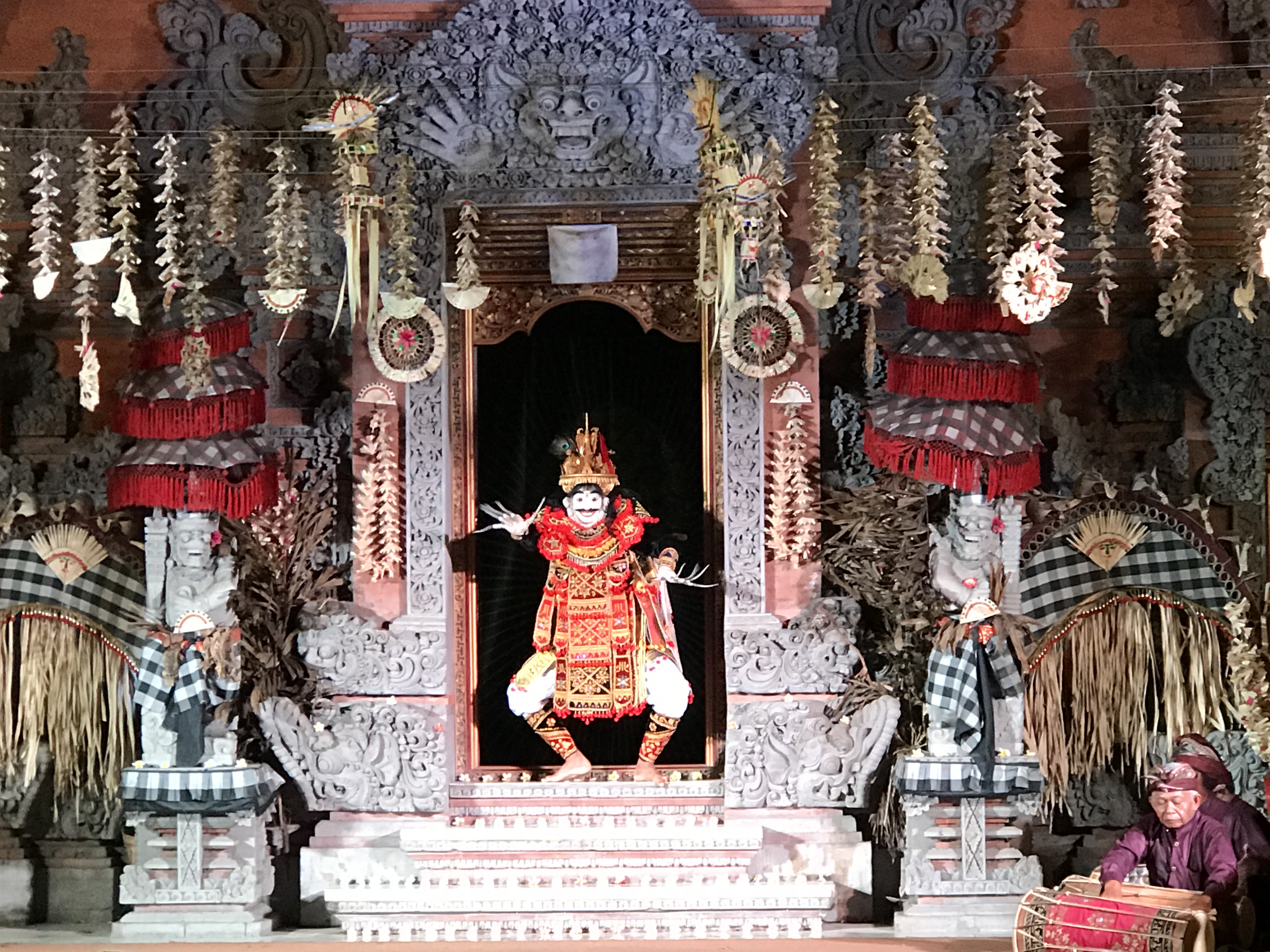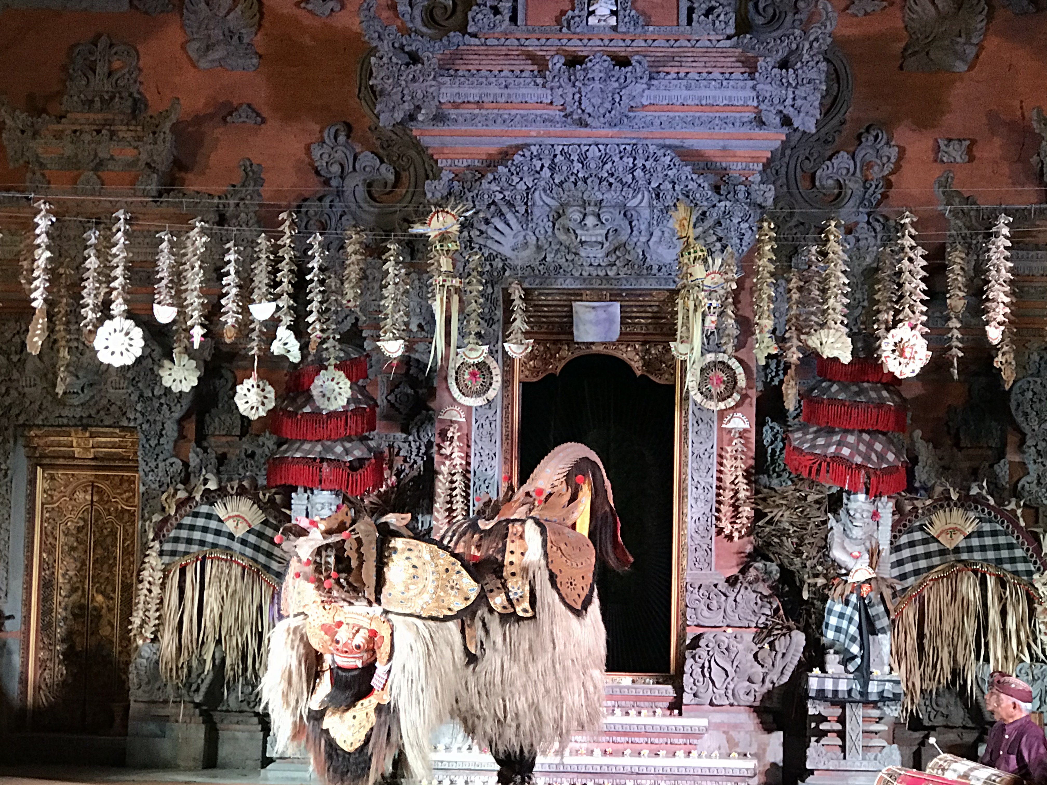 Chaque soir, il y a différents types de spectacle offert dans l’enceinte de plusieurs temples d’Ubud. Ils sont plutôt variés et très colorés. Nous avions opté pour celui du temple Pura Dalem Ubud, car il y avait la présence du fameux « Barong » et on croyait qu’Alexis aimerait cela! Effectivement, le spectacle d’environ 1 heure était très beau et Alexis a bien apprécié même s’il y avait certaines longueurs. Je croyais qu’on en apprendrait un peu plus sur l’histoire pendant le spectacle, mais en réalité, même en lisant bien le prospectus qu’on nous a remis, nous avons eu de la difficulté a lier chaque danse à son histoire. On achète son billet d’un volontaire habillé en habit traditionnel sur la rue principale environ 10 $ CAD par adulte et gratuit pour les enfants.