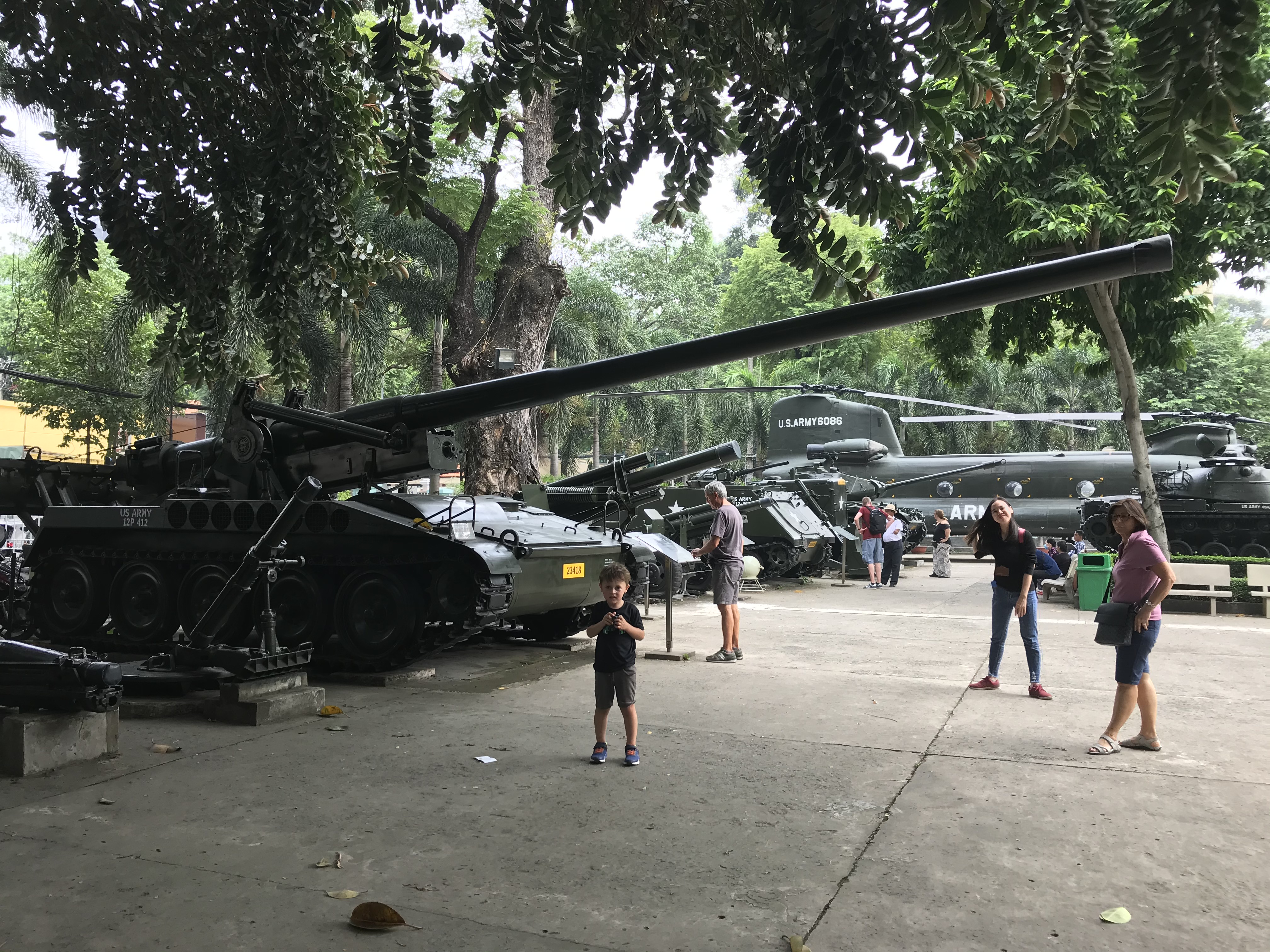 6 Musée de la Guerre : Nous nous sommes beaucoup questionné à propos du musée de la guerre avec Alexis (5 ans). Suivant plusieurs lectures sur les blogs nous avions décidé de l’amené avec nous, mais de choisir les salles d’expositions en conséquence. Nous trouvions aussi que c’était une belle opportunité de lui montrer les vraies conséquences de l’utilisation des fusils (comme tous les petits garçons, il aime les fusils)…. Pour le volet éducatif, c’était réussi, car il a vu que les fusils ne sont pas des jouets maintenant. Il a même eu l’occasion de serrer la « main » d’un survivant qui a perdu ses 2 bras et une de ses deux jambes sur une mine antipersonnel. Ce moment nous a beaucoup ému, car sans aucune hésitation, il a tendu la main à cet homme même si physiquement, il était très différent des autres personnes qu’il a rencontré. On était bien fier de notre grand encore une fois ! Il faut comprendre que l’ensemble du musée est raconté avec l’œil du gouvernement du Nord (communiste), donc vous aurez une seule version de l’histoire, mais quand même, c’est à vous d’en juger après. Le musé commence avec l’exposition des avions, hélicoptères et autres appareils militaires américains. C’est dehors, c’est gros et impressionnant. Ensuite, vous pouvez visiter les anciennes prisons utilisées par les Américains pour capturer et torturer les combattants. L’endroit est terrifiant, surtout qu’ils ont mis des genres de mannequins pour le réalisme… Ce n’était pas nécessaire. Si c’était à refaire, je n’amènerais pas un enfant dans cette section. Ensuite, vous entrez dans le musée qui est divisé en 8 salles. Commencez par le haut, car l’histoire se déroule du 3e étage vers le rez-de chaussé en ordre. La plupart des salles sont convenables pour un enfant, sauf ceux sur l’utilisation des armes chimiques (gaz Orange). Il y a eu plus de gaz chimique utilisé pendant la guerre du Viêtnam que pendant la secondaire guerre mondiale, les images sont très difficiles à regarder, car ils concernent l’impact sur les enfants… Donc à éviter avec vos enfants en jeune âge selon nous. La fin du musée termine heureusement sur une note plus positive en parlant de la reconstruction, la décontamination des champs de mines et de la génération d’aujourd’hui. Environ 4 $ CAD par adultes et gratuit pour les enfants