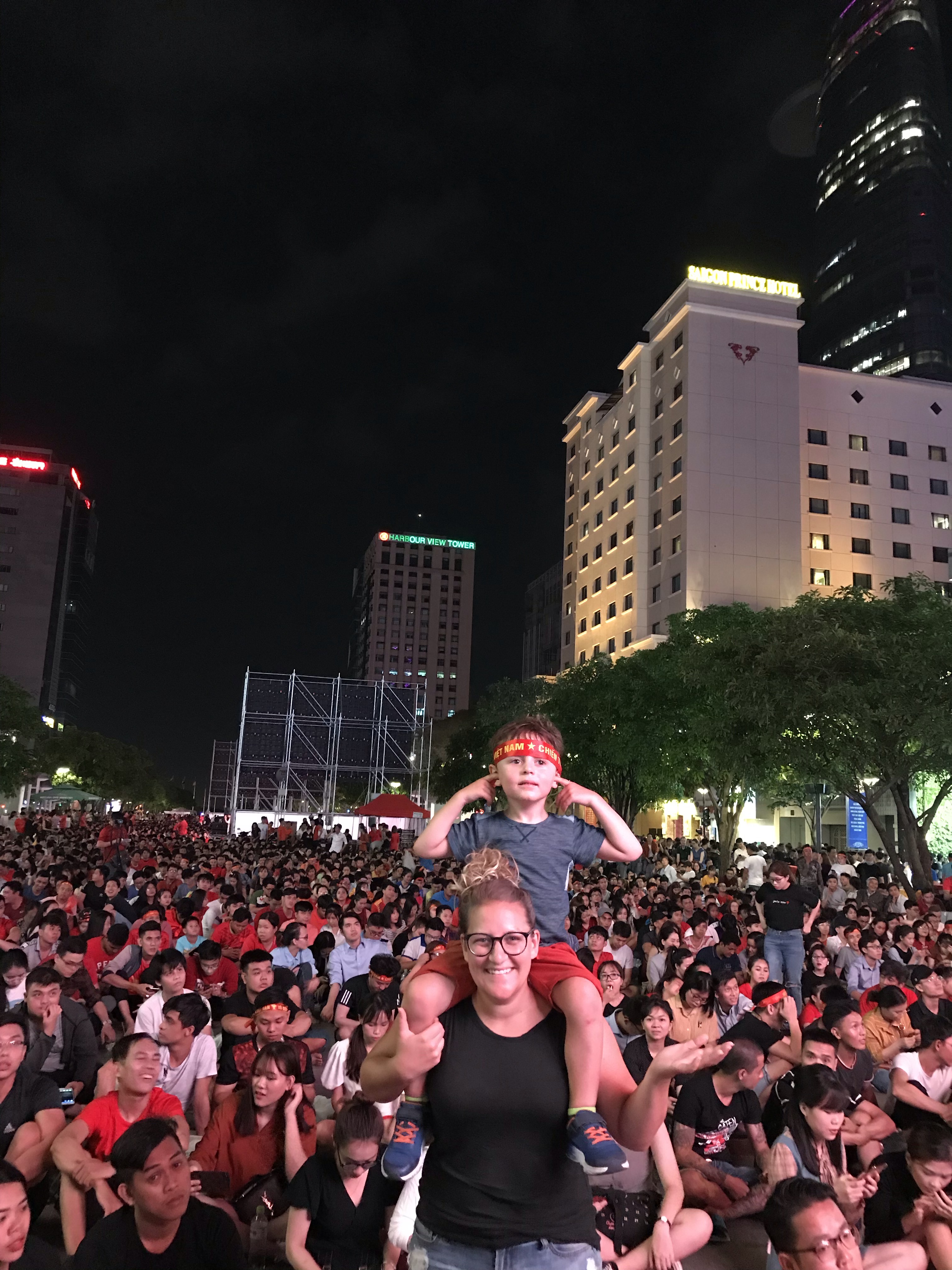 Les Vietnamiens adorent le Football. Nous étions tellement chanceux, il y avait un match de qualification pour la coupe du monde qui avait lieu à Hanoi. Ce match, opposant l’Indonésie au Vietnam, était diffusé sur d’immenses écrans géant au milieu de la rue Nguyen Hue. Il y avait des dizaines de milliers de fans, c’était totalement génial. Ambiance familiale, tout le monde mange partout, c’était la fête ! Quel beau moment nous avons vécu…Pendant un moment, nous étions Vietnamiens et non pas touriste. Nous avons fait la rencontre d’une étudiante qui parlait bien anglais, elle nous a recommandé d’excellents restos ce qui a influencé le reste de notre périple. Elle a même décoré Alexis et moi avec plein d’article pour supporter le Vietnam football team. Merci encore à toi 🙂