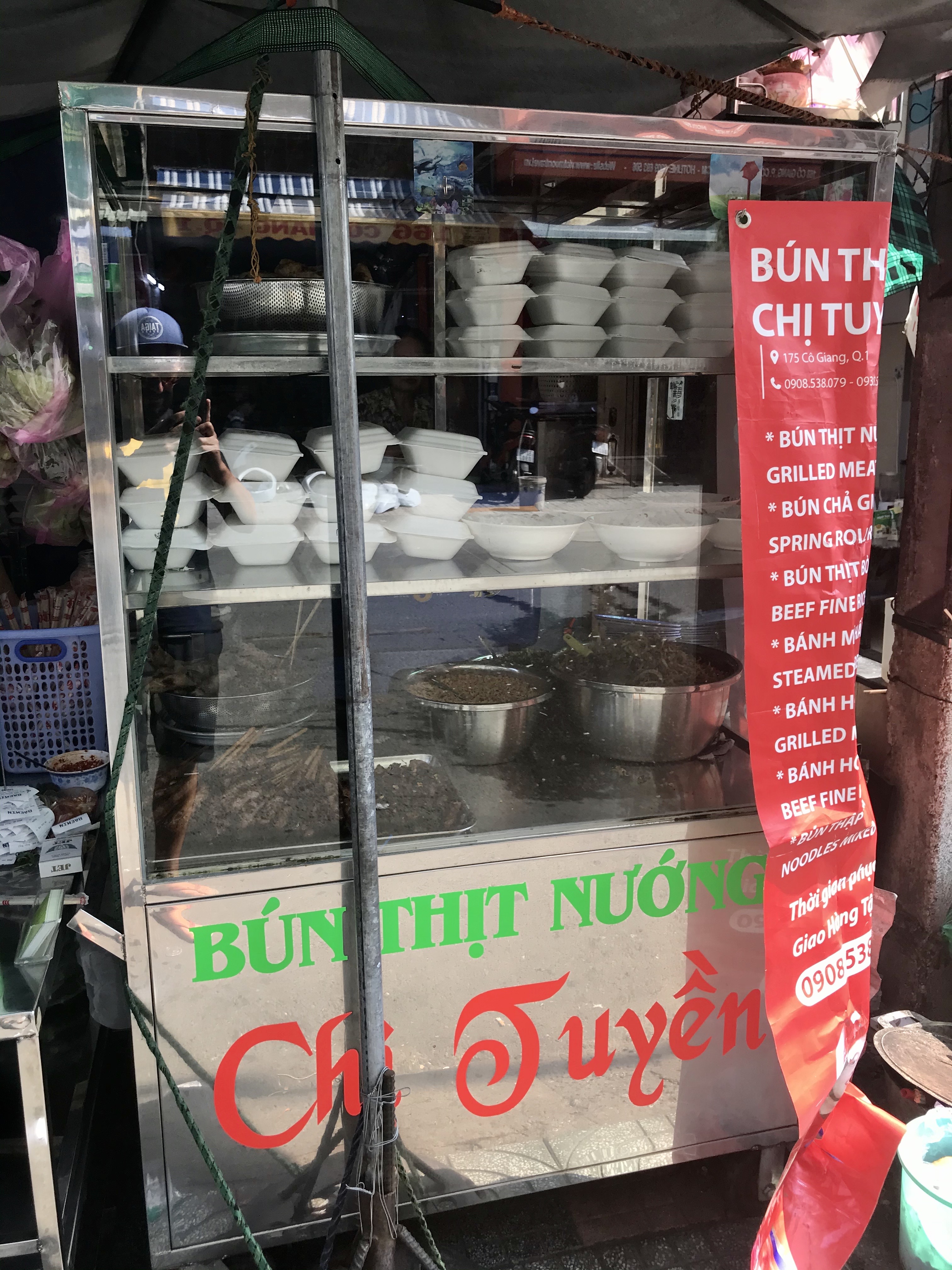 - Bun Thit Nuong Chi Tuyen : notre plus gros coup de cœur du voyage. Cet endroit nous avait été recommandé par notre nouvelle amie du football. C’est dans un quartier non-touristique, situé tout près d’une université. Quand on voit l’endroit de l’extérieur, on n’est pas trop certain, mais quand vous verrez le vas et viens devant le commerce vous savez que vous êtes au bon endroit. L’intérieur est très grand et très propre pour le genre d’endroit. Il y a un menu en anglais ce qui facilite beaucoup. C’est un incontournable tout simplement pour le « banh hoi thit nuong ». Environ 2.50 $ CAD par assiette (175C Co Giang, D1)