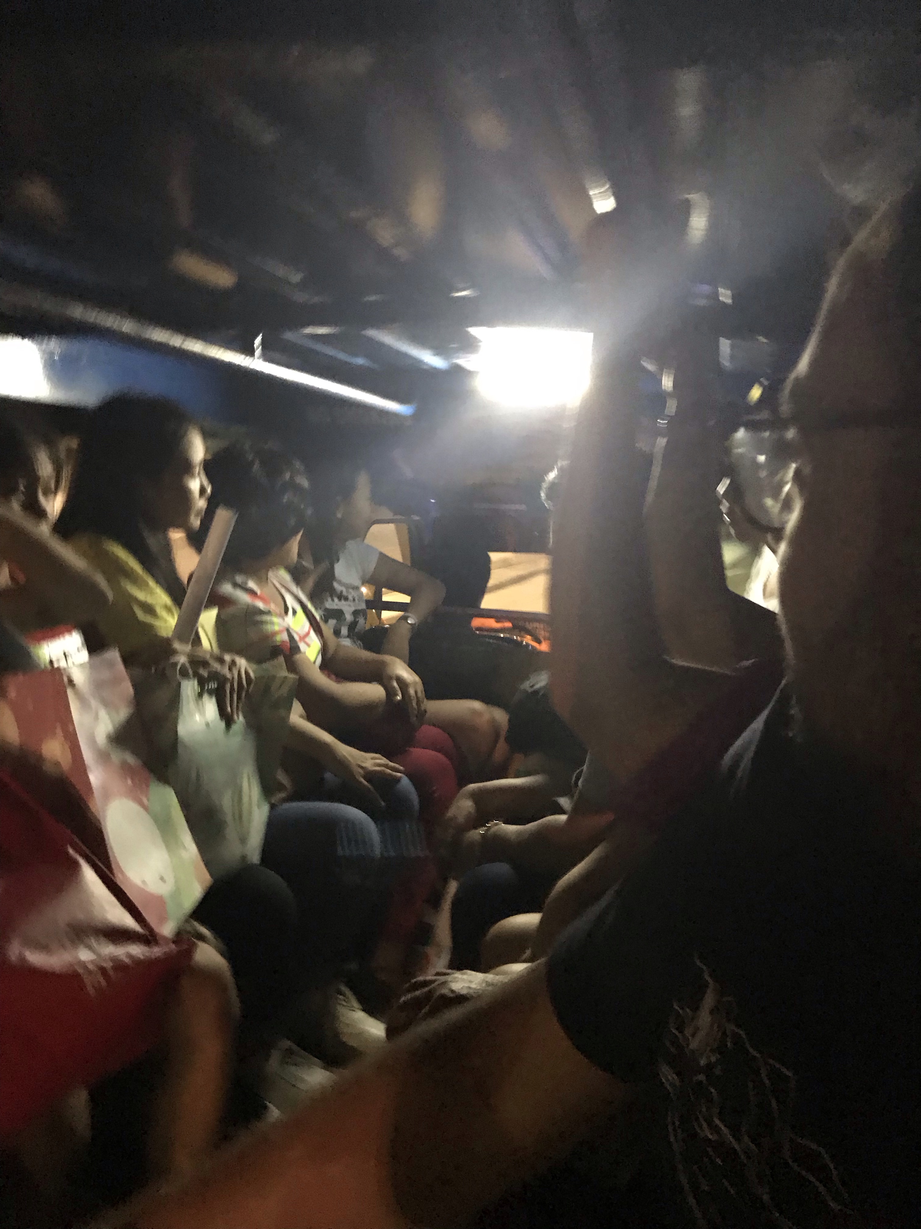 Dès que les parents d’Isabelle nous rejoignent, on quitte en GRAB vers le Piers1 pour prendre le traversier vers Bohol. Philippe assit dans le coffre avec Alexis, l’expérience des Philippines commence ! Environ 30 minutes pour rejoindre le port un dimanche sinon, ce sont 45 à 60 minutes. Le GRAB 6 places coûte environ 8$CAD