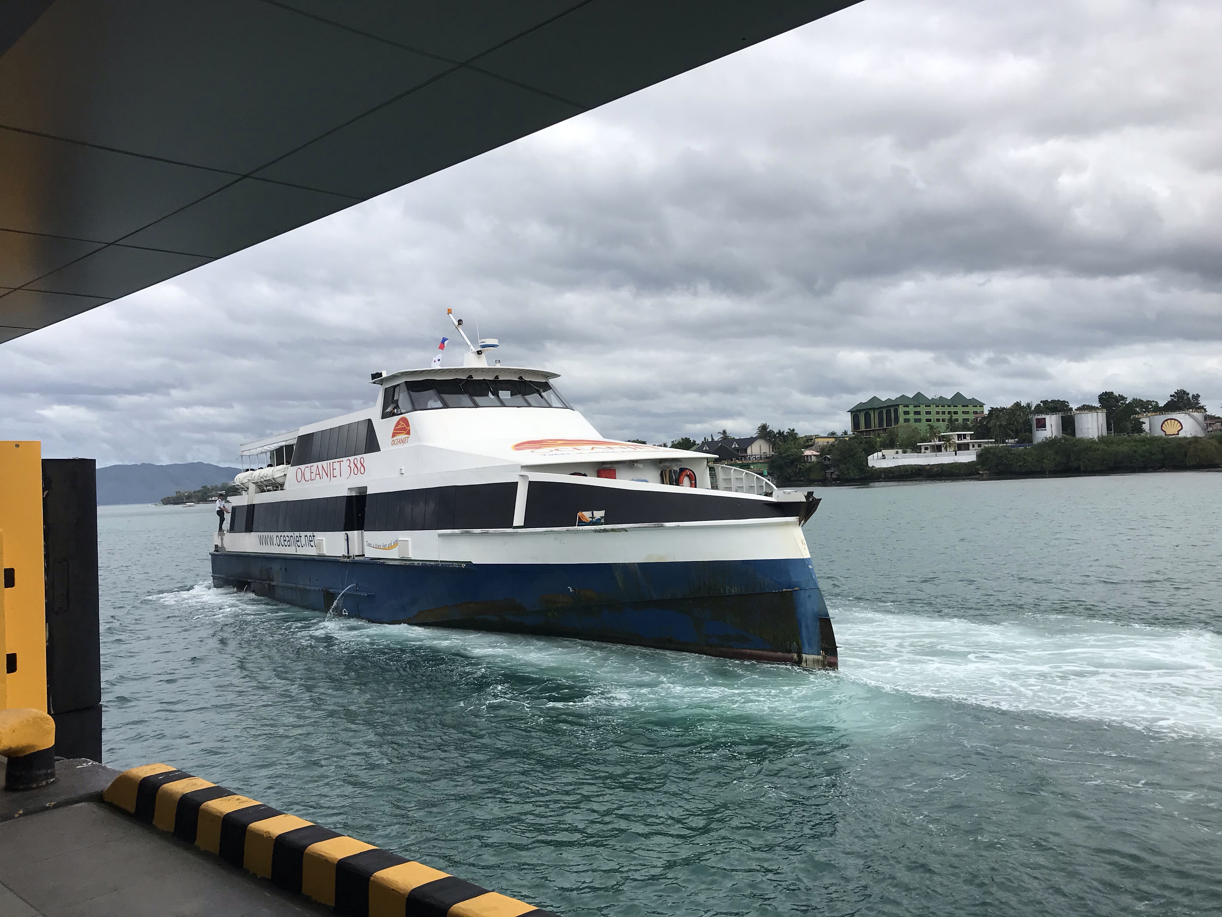 Au Pier 1 de Cebu nous prenons le Fast Ferry « OceanJet » à destination de Bohol. Puisque le traversier est le moyen de transport des Filipino, le Pier 1 ressemble plus à un aéroport domestique avec sécurité, chien renifleur et chaos habituel de l’Asie. L’endroit est glauque et les alentours sont d’une beauté visuelle très ordinaire. Heureux d’avoir nos billets en poche, la file d’attente de la compagnie de bateau était interminable et semblait comme toujours très compliquée ! Un billet coûte environ 13 $ CAD en classe « touriste » avec confort acceptable, mais sans plus. On part à l’heure et deux heures plus tard, on arrive à Tagbilaran (capitale de l’île de Bohol). Un transport en mini van privé nous attendait pour rejoindre Panglao (30 minutes), réservé avec notre hôtel pour 15 $ CAD. Heureux d’avoir nos billets en poche, la file d’attente de la compagnie de bateau était interminable et semblait comme toujours très compliquée !
