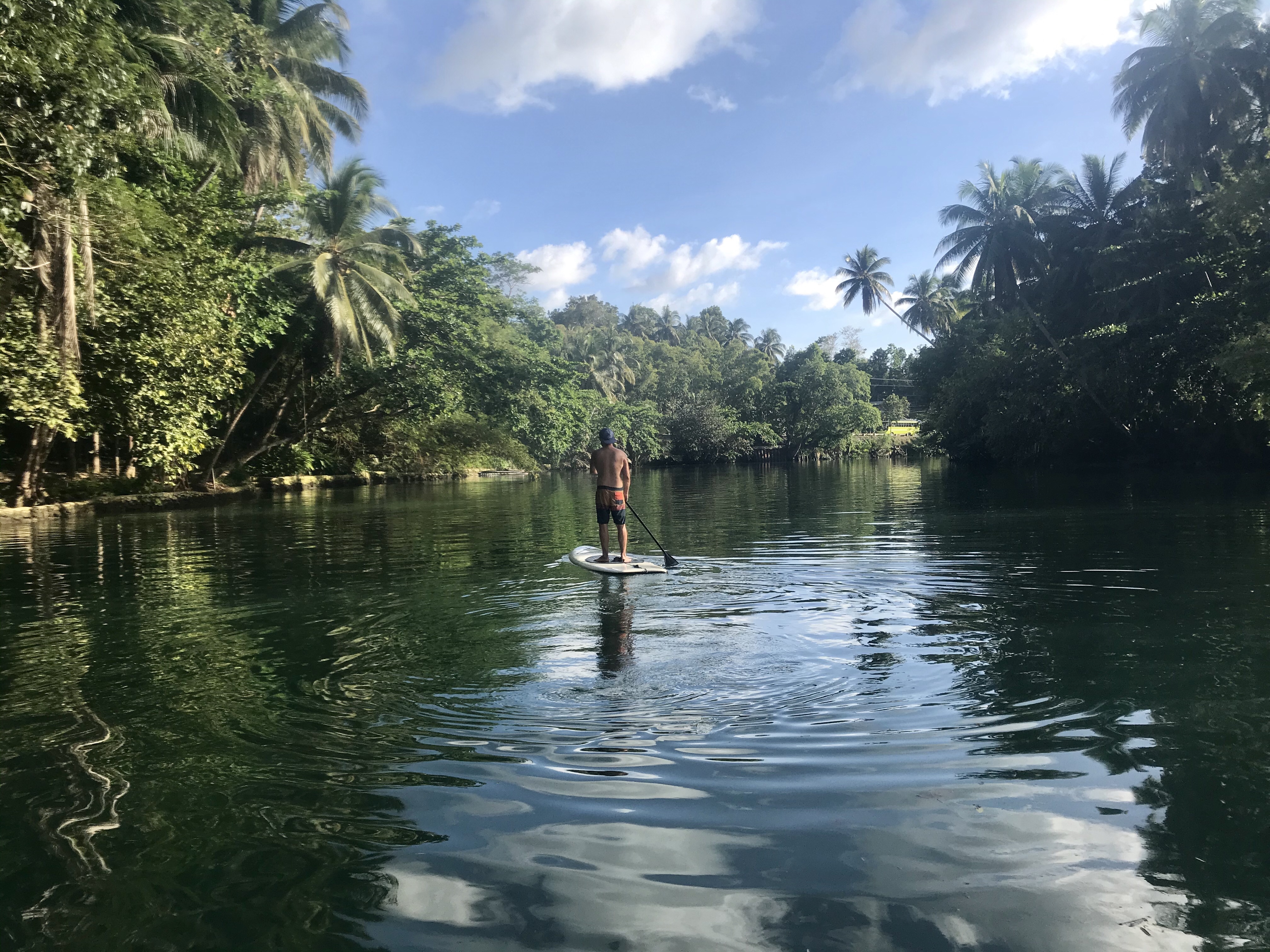 5 Loboc River Paddle Board : Pour nous, le highlights des activités à faire a Bohol! Les parents d’Isa ayant gentiment décidé de passer la journée avec Alexis, nous avons sauté sur nos motos pour une randonnée de 60 minutes vers la Loboc River accompagnés de Phil. Arrivée au Loboc River Resort, la vue est juste magnifique. Nous avons mangé au petit bistro sur le bord de la rivière avant de commencer notre aventure en stand up paddle. Au début, 1h30 de SUP pour monter la rivière vers les petites chutes en côtoyant les bateaux restaurants qui nous prennent en photo ! L’exercice est intense, mais la baignade dans les chutes cristalline valait tout l’effort. Au retour, il est 15h30 et plus aucun bateau-resto. Nous avons donc la rivière pour nous afin d’effectuer la descente (beaucoup moins fatigante). Les paysages sont uniques et magnifiques. Il y a des petits hôtels le long de la rivière, mais la majeure partie est intacte. Un des plus beaux paysages que nous avons pagayé à ce jour. (Loboc River Resort / 40$ CAD par adulte pour 4 heures de SUP avec un guide / 13h à 17h).